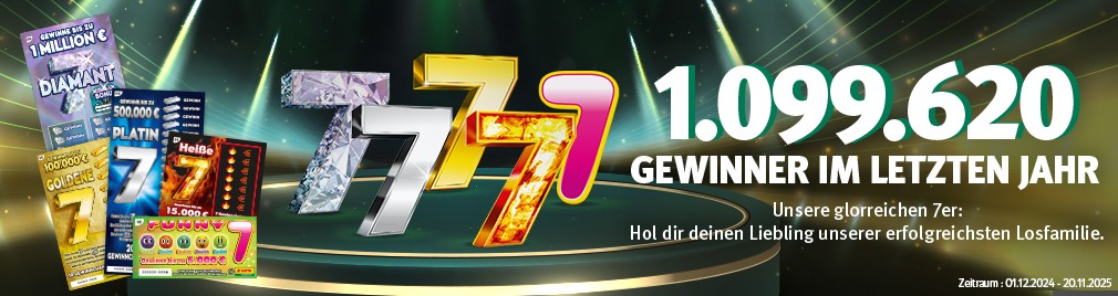 Die 7er-Familie hat im letzten Jahr bereits für Begeisterung gesorgt: 1.099.620 Gewinnerinnen und Gewinner konnten sich über einen Treffer freuen. Die fünf Rubbellose rund um die beliebte Zahl 7 bieten Gewinnchancen – von 5.000 € über 100.000 € bis hin zu 1 Million €. Hier ist für jeden etwas dabei. Lern noch heute unsere 7er-Familie kennen und erlebe selbst den Spielspaß.